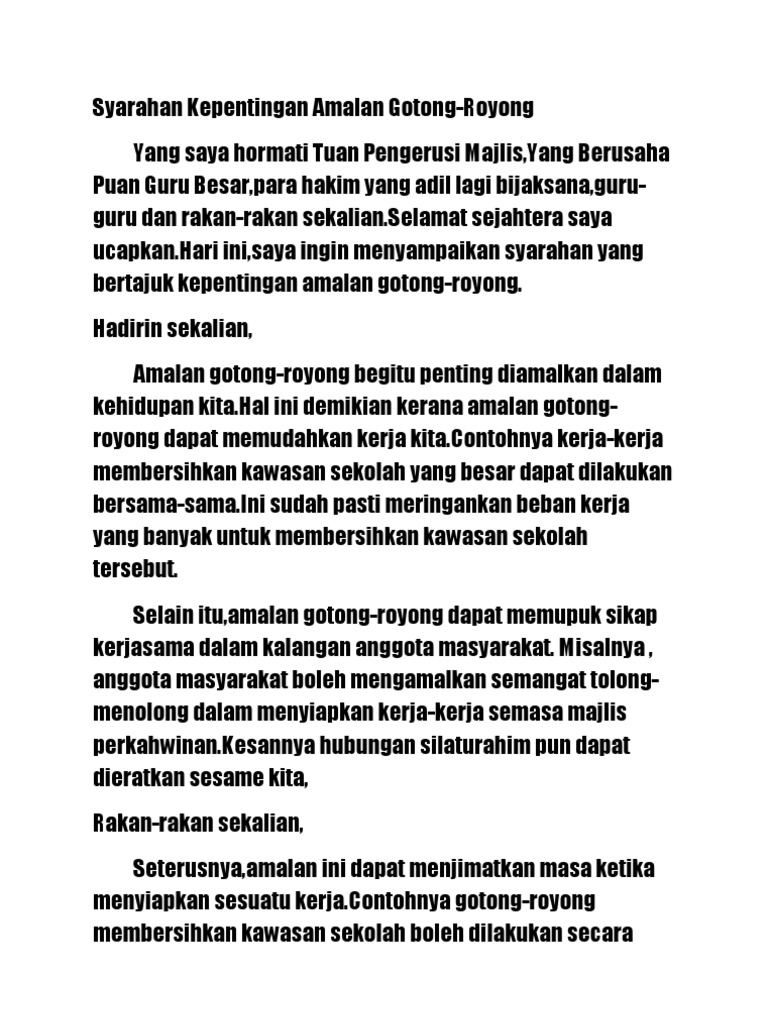 Dengan menjadikan amalan ini sebagai aktiviti penting dalam kehidupan, kita dapat banyak memperoleh. Ini sudah pasti meringankan beban kerja yang banyak untuk membersihkan kawasan sekolah tersebut. Walaupun tidak berarti kita harus meampertahankan faktor pendorong adanya gotong royong tersebut. Pengertian gotong royong dalam kbbi : Ia juga merupakan sebahagian daripada cara hidup atau adat resam dalam masyarakat khususnya apabila adanya kenduri perkahwinan, perayaan, mahupun sesuatu majlis.